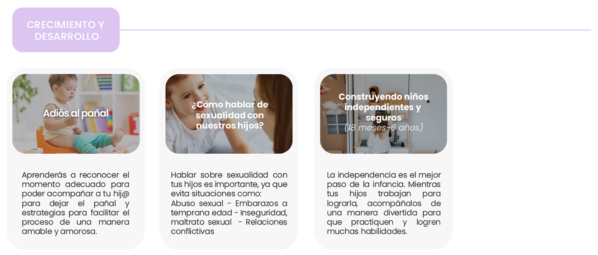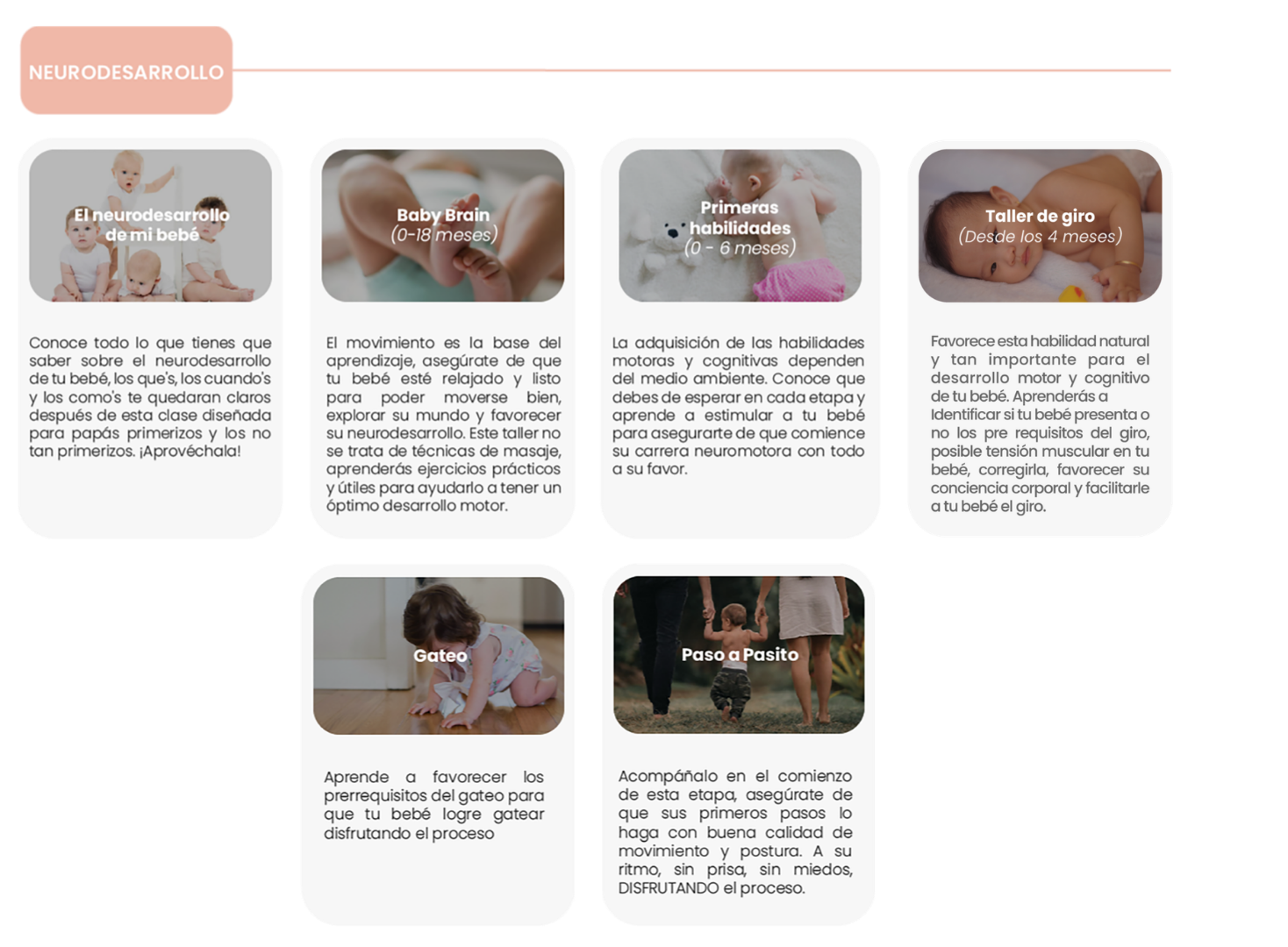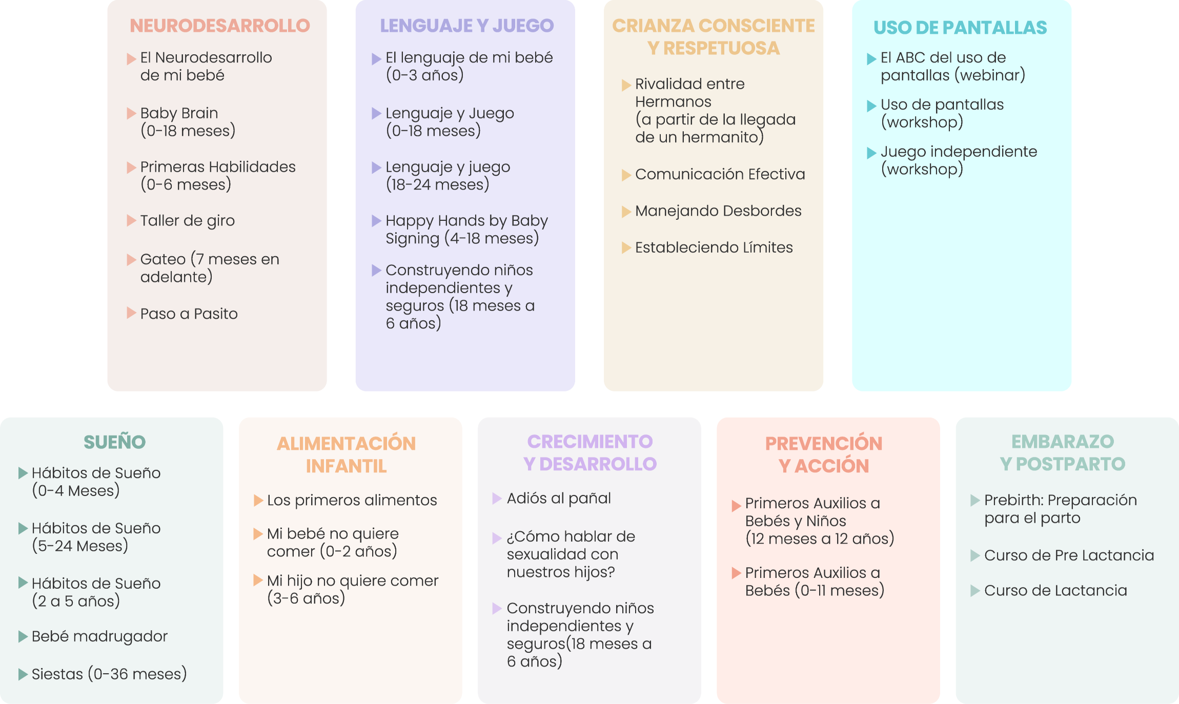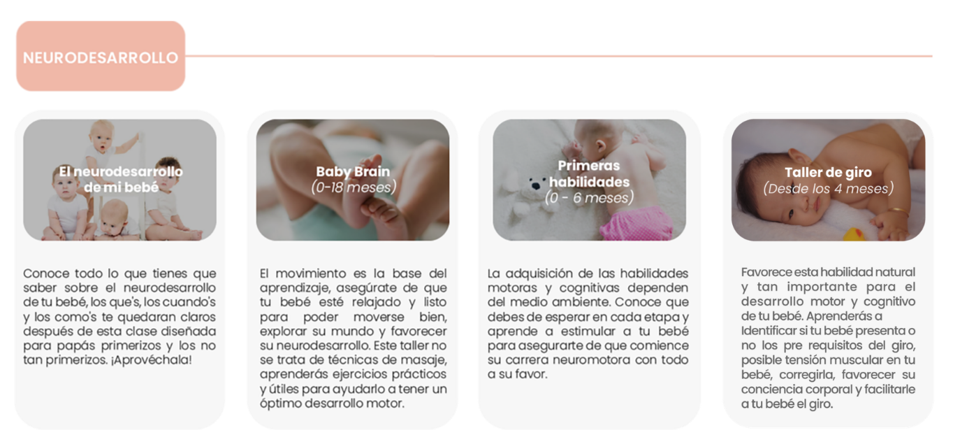 En cada una las áreas encontrarás diversos cursos y/o talleres en los cuáles podrás adquirir herramientas y recursos que favorecerán el desarrollo de tu peque y te acompañarán durante tu m/paternidad.
